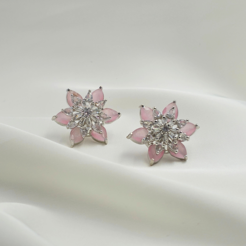 2 in 1 Pink & Clear Medium Sized AD Flower Silver Plated Stud Earrings